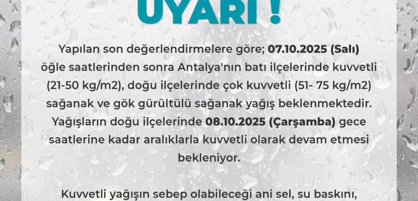 Meteoroloji Genel Müdürlüğü’nden yapılan son değerlendirmelere göre, 07 Ekim 2025 Salı günü öğle saatlerinden sonra Antalya genelinde kuvvetli yağışlar bekleniyor.
